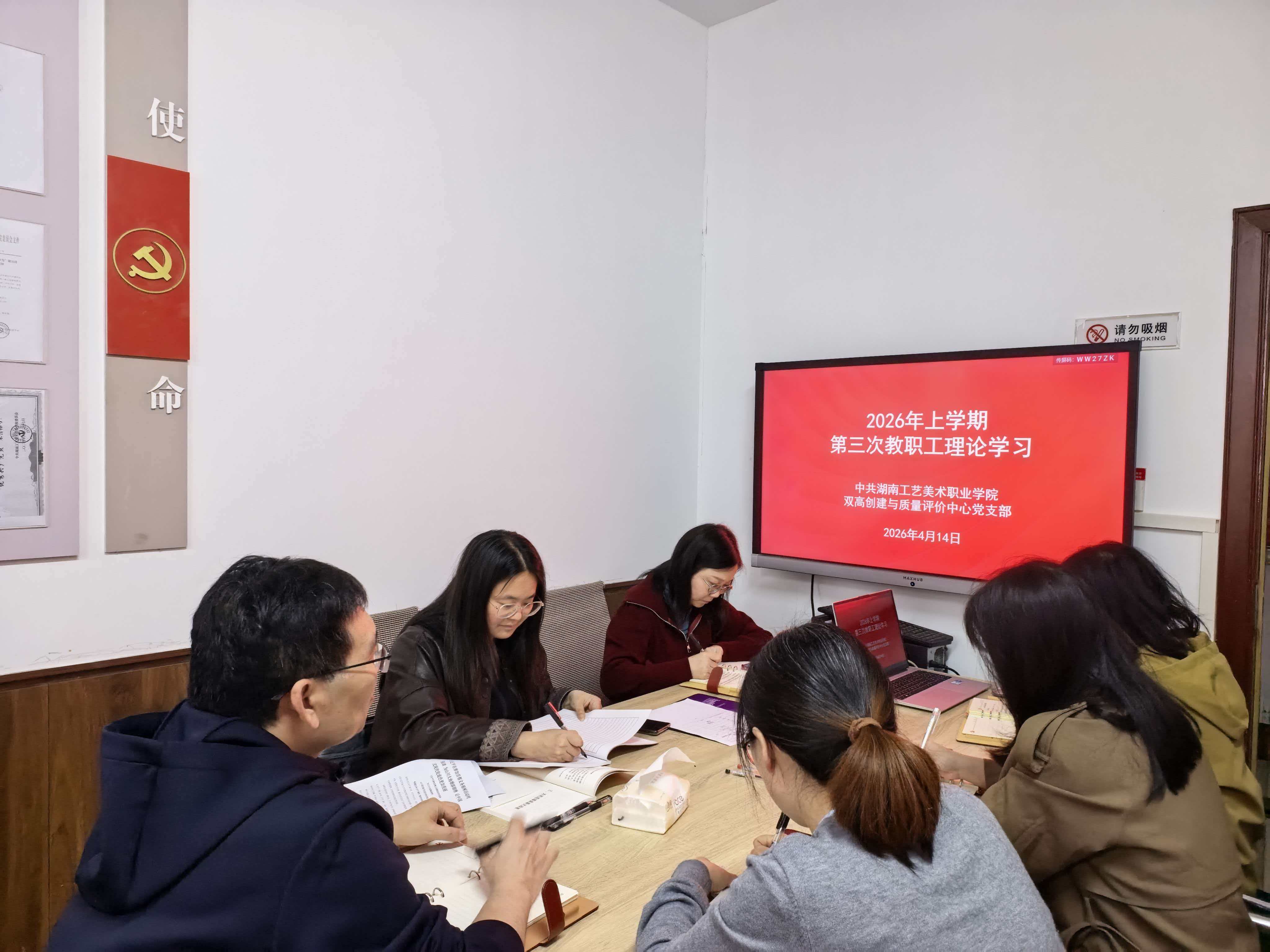 4月14日下午,双高创建与质量评价中心党支部组织开展2026年上学期第三次政治理论学习。会议由党支部书记谢志杰主持,支部全体党员参加。