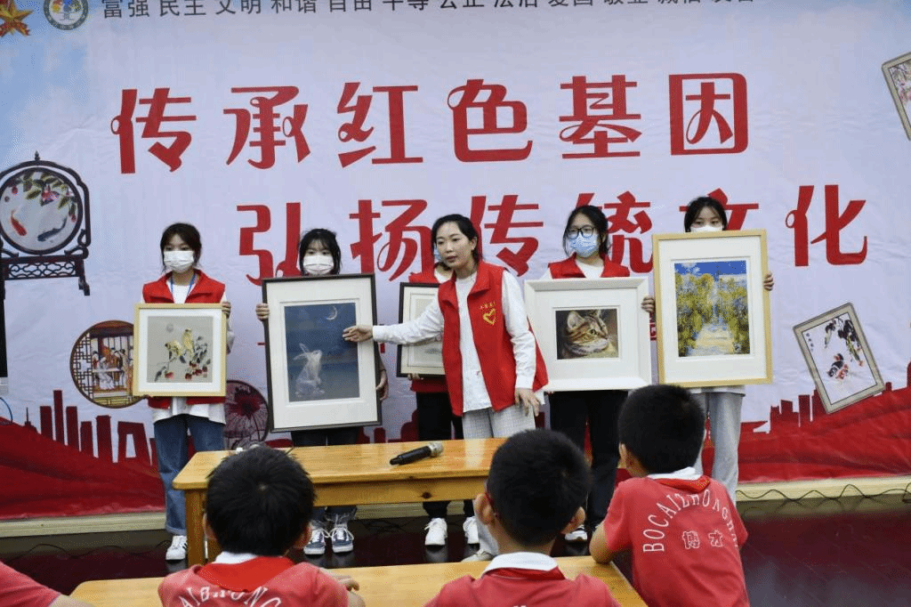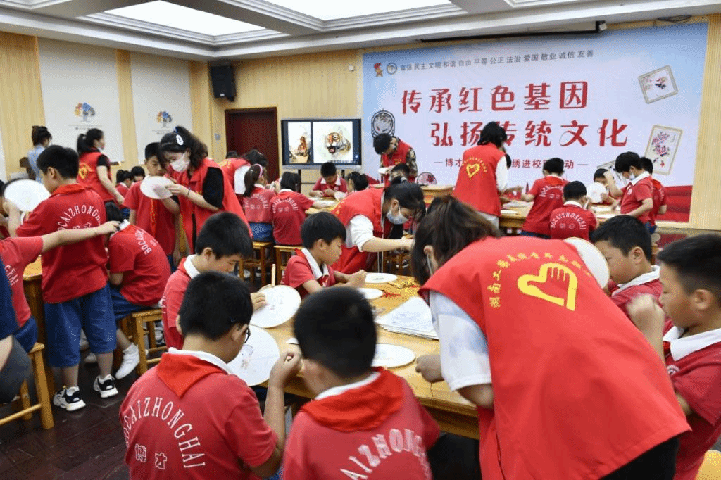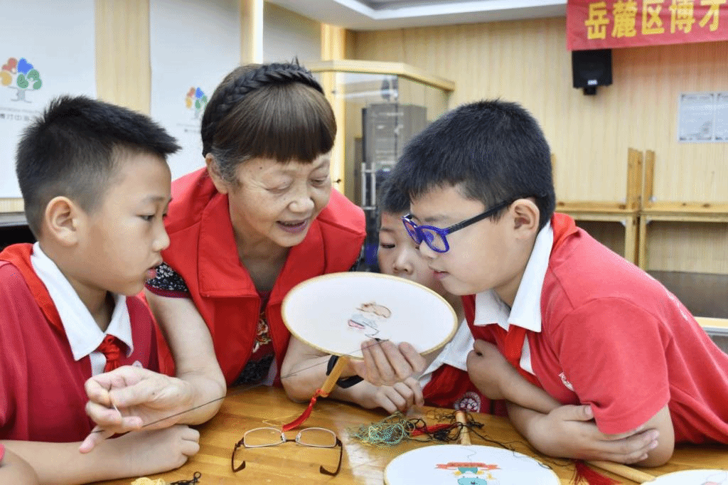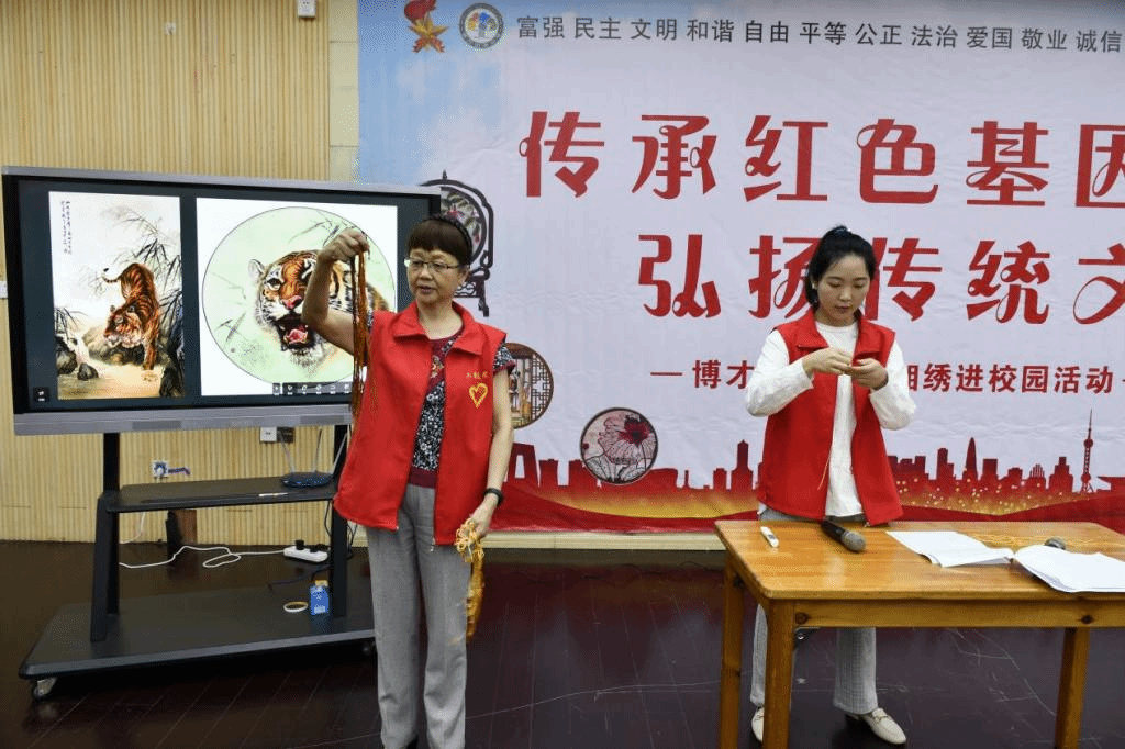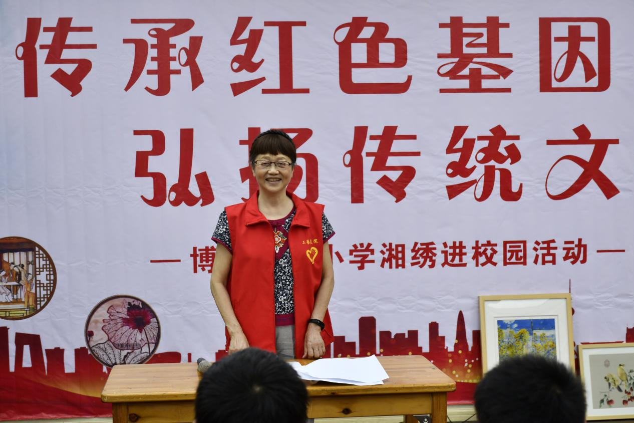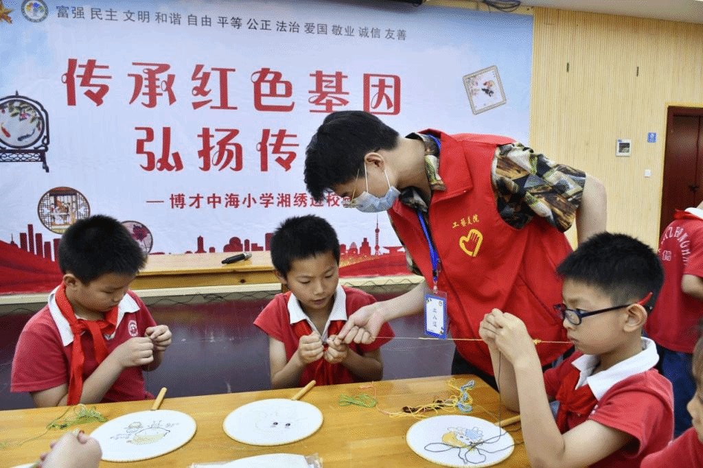 刺绣艺术专业委员会继前两期中国工艺美术科普教育活动之后,持续推进第三期活动。6月15日,走进长沙市岳麓区博才中海小学,开展了以“传统文化启童心,湘绣非遗伴成长”为主题的湘绣文化进校园活动。