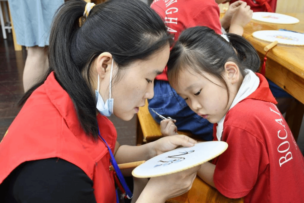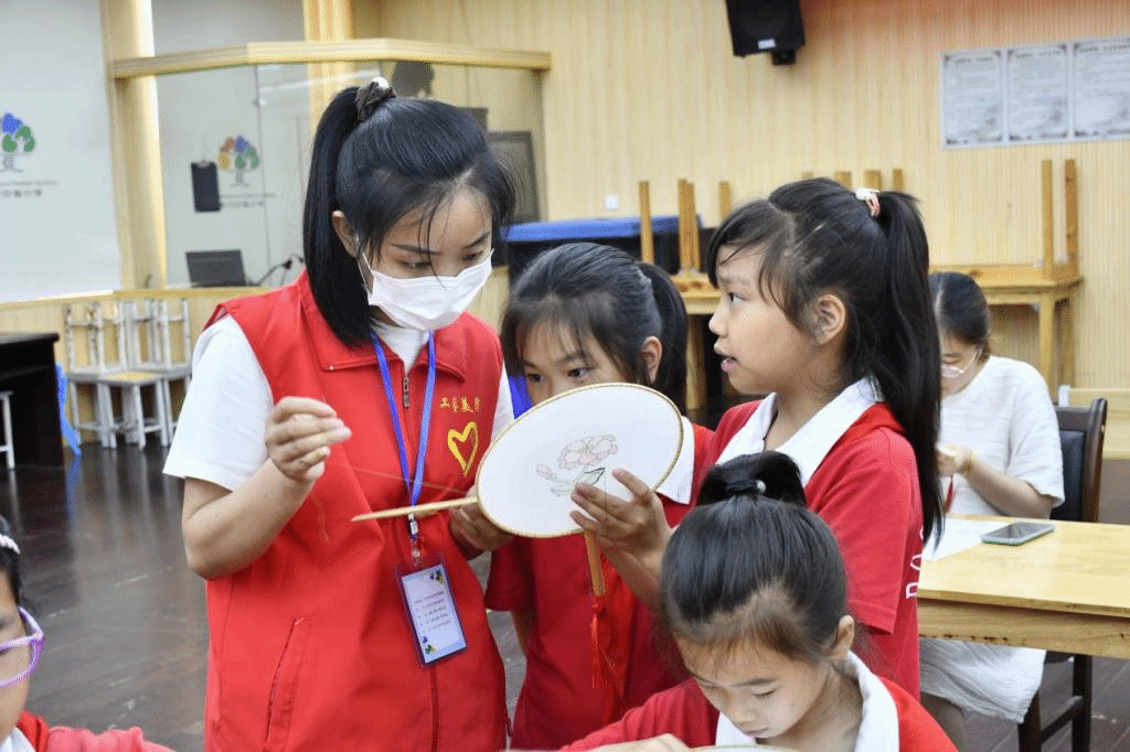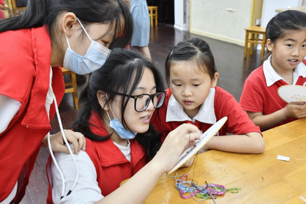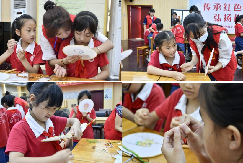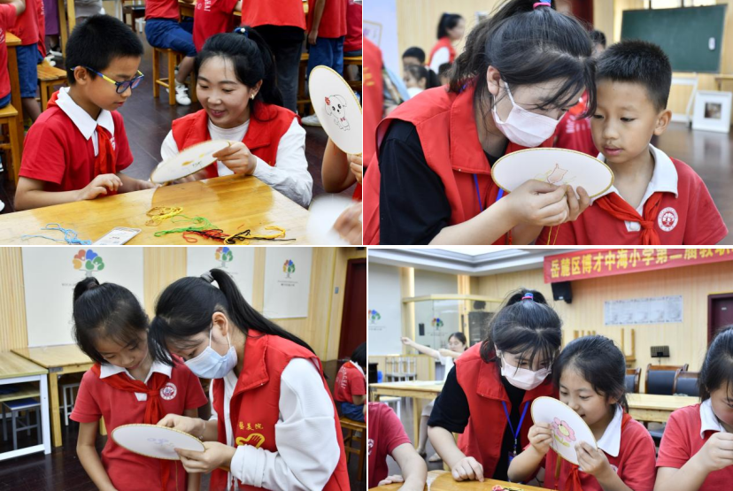 欣赏完湘绣作品,从来没有拿过针线的孩子们迫不及待地参与到了刺绣体验环节。他们在刺绣科普团队的耐心指导下进行劈线、穿针、刺绣,并在团扇上一针一线绣出了自己喜欢的图案。体验结束后,他们仍然意犹未尽,感叹道“时间太短,希望还能有更多的机会学习湘绣”。