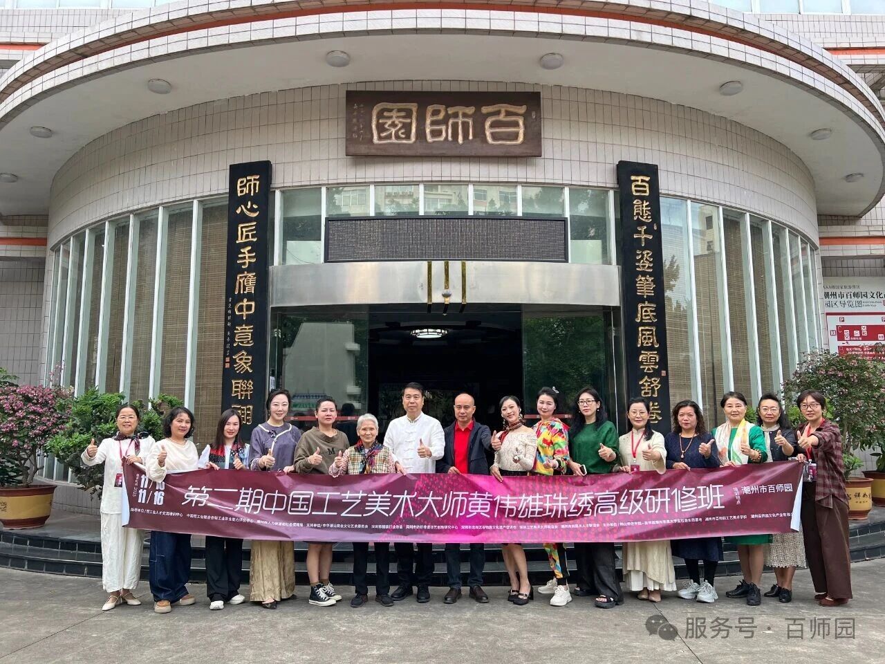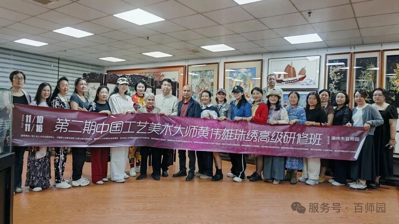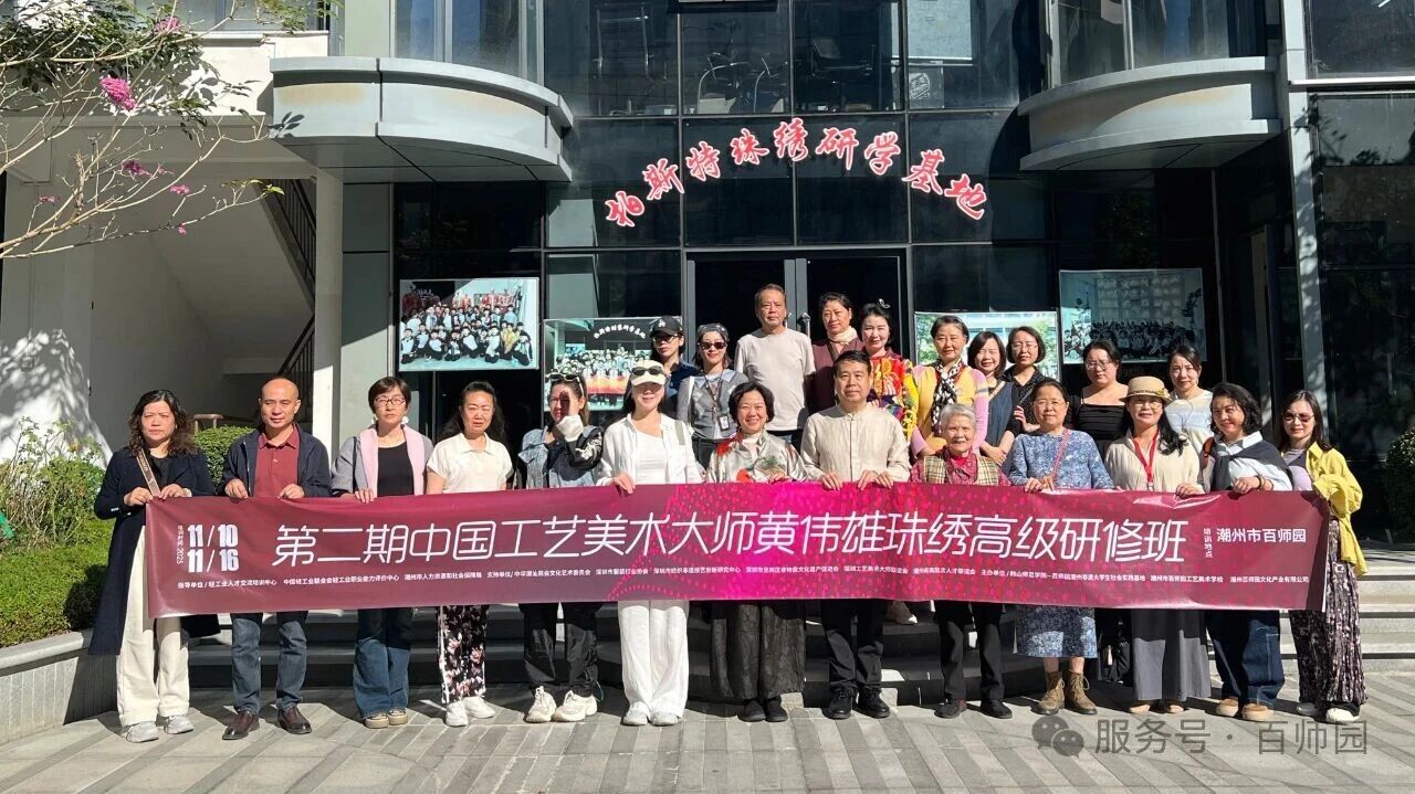 11月16日,为期一周的第二期中国工艺美术大师黄伟雄珠绣高级研修班在潮州百师园圆满落下帷幕。本次研修班在轻工业人才交流培训中心、中国轻工业联合会轻工业职业能力评价中心、潮州市人力资源和社会保障局的指导下,在中华潮汕商会文化艺术委员会、深圳市服装行业协会、深圳市纺织非遗技艺创新研究中心、深圳市龙岗区非物质文化遗产促进会、深圳工艺美术大师联谊会、潮州市高层次人才联谊会的支持下,由韩山师范学院-百师园潮州非遗大学生社会实践基地、潮州市百师园工艺美术学校、潮州百师园文化产业有限公司主办,潮州市百师园创意馆、潮州市黄伟雄珠绣博物馆、深圳市百师园工艺美术研究院、深圳市百师园非物质文化遗产博物馆联合协办。