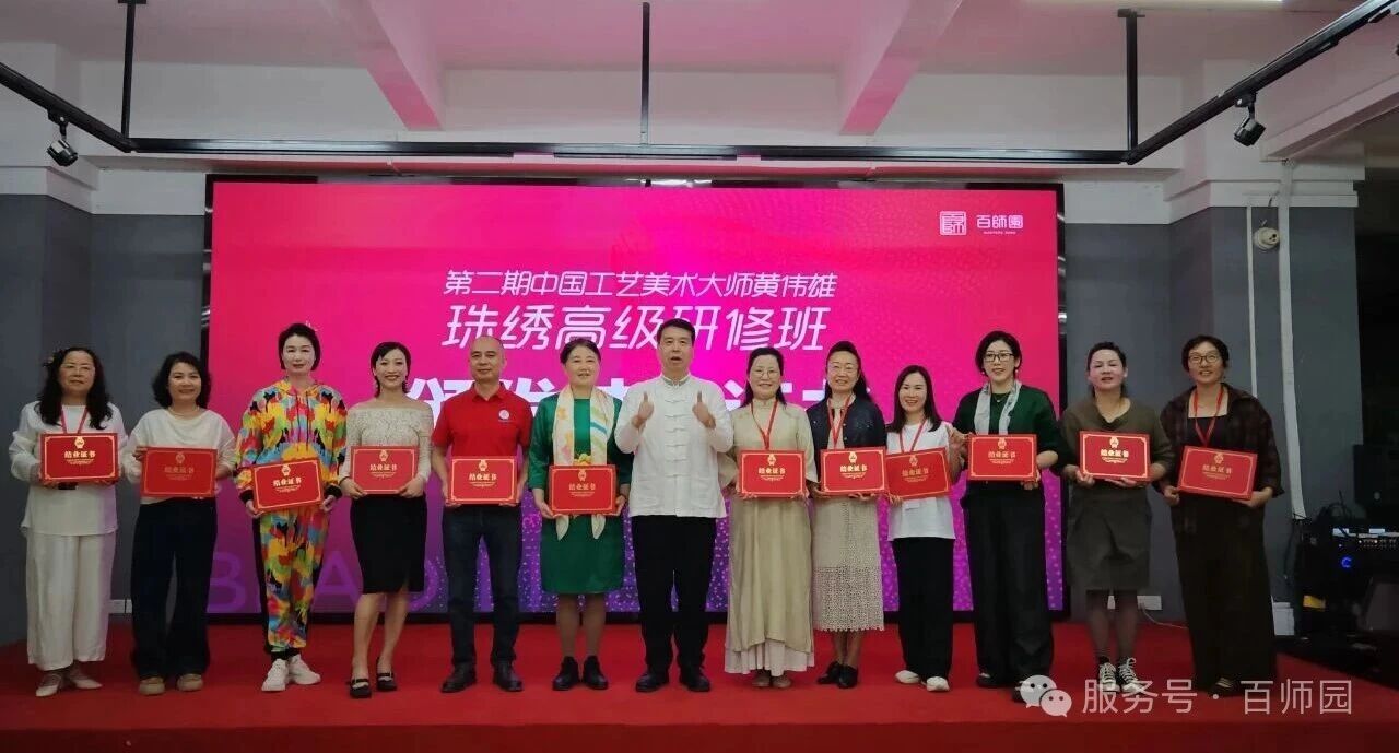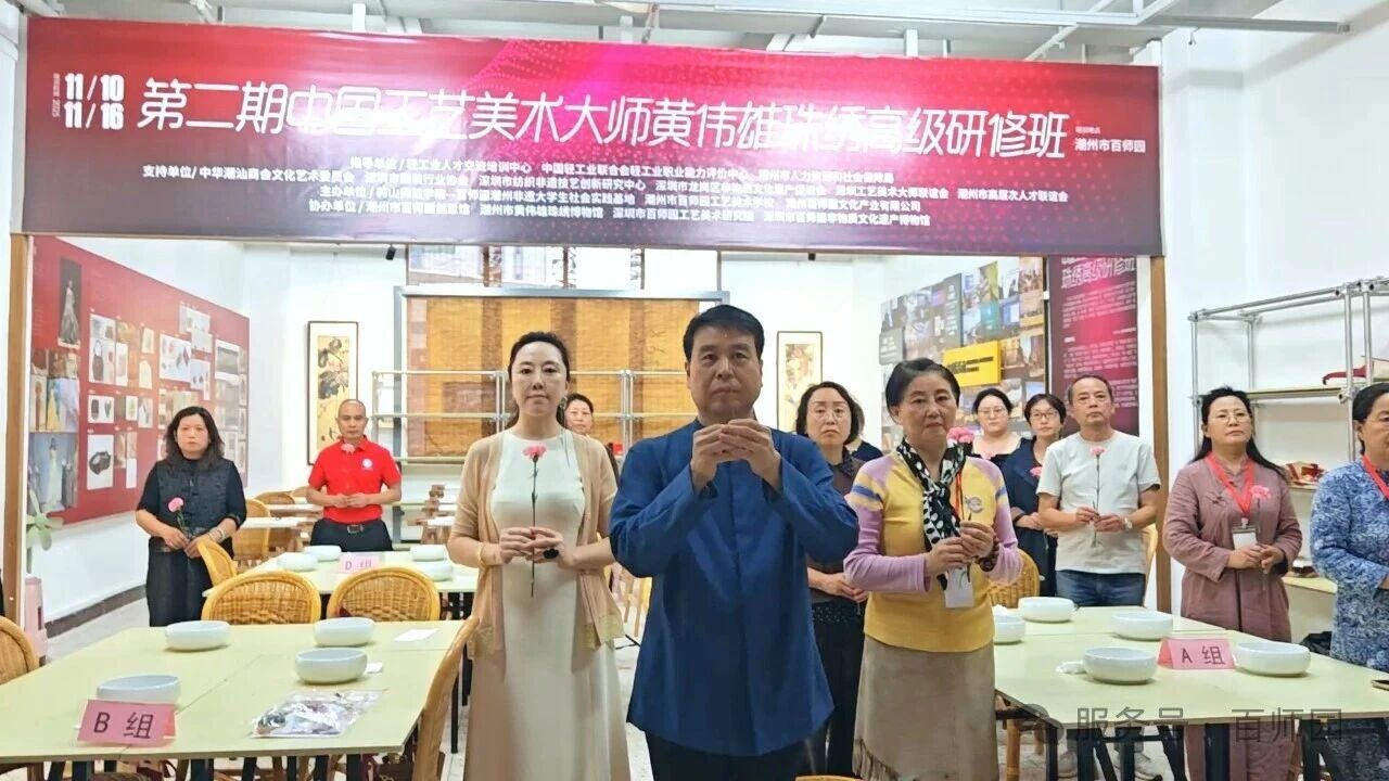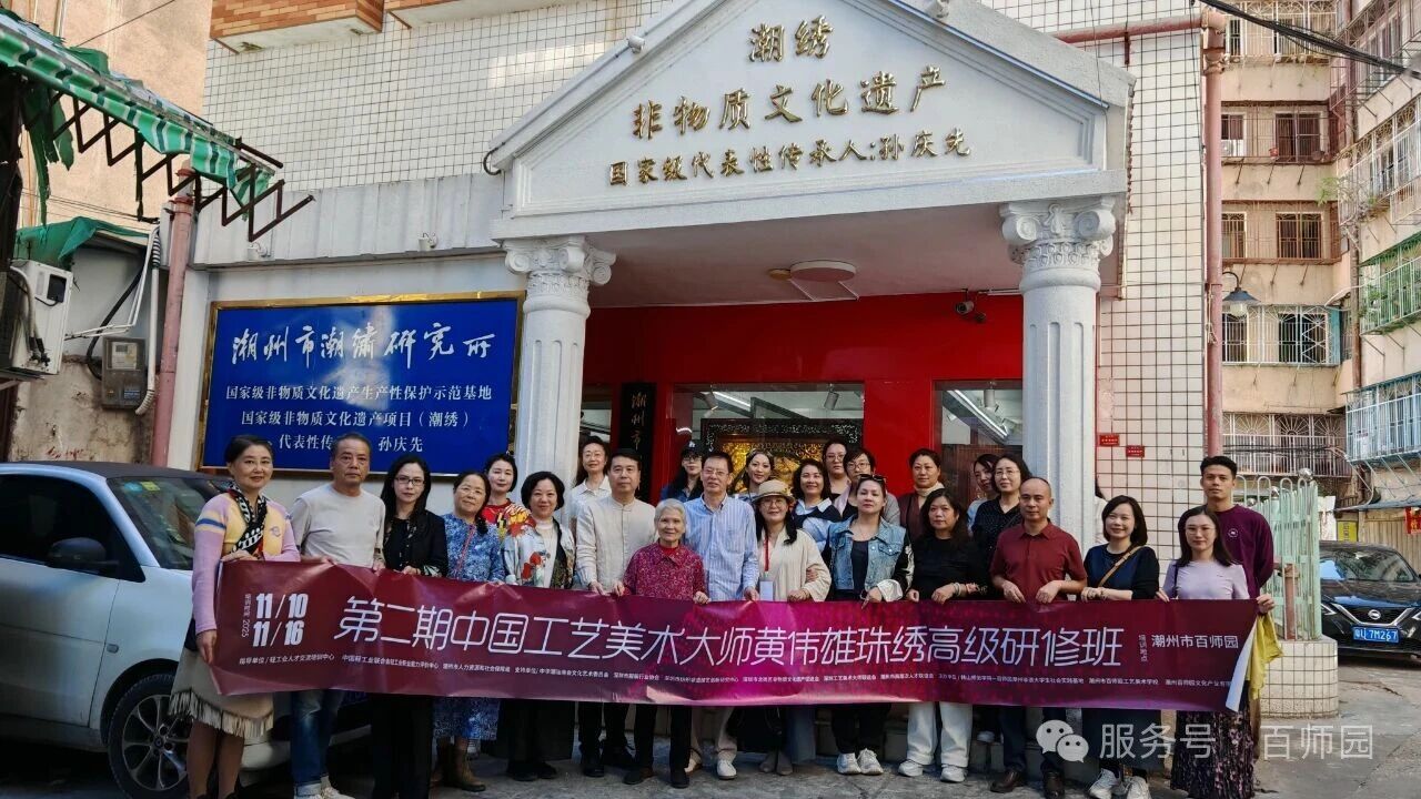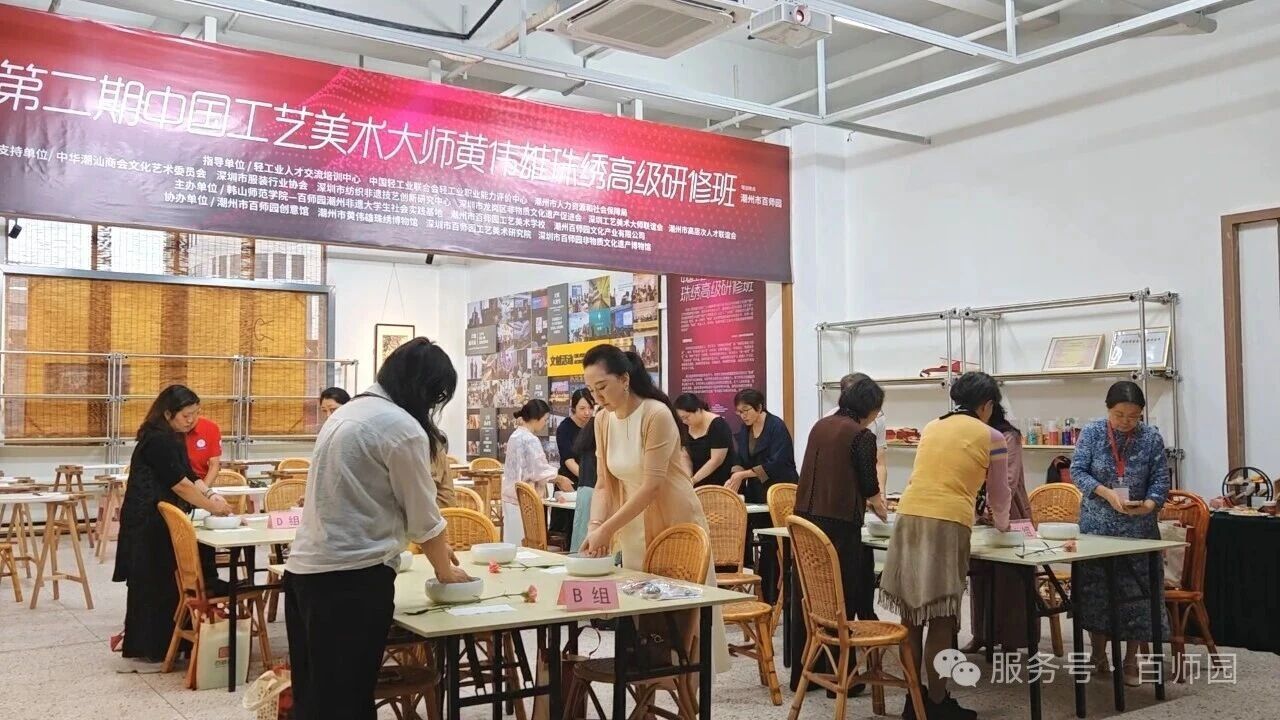 11月16日,为期一周的第二期中国工艺美术大师黄伟雄珠绣高级研修班在潮州百师园圆满落下帷幕。本次研修班在轻工业人才交流培训中心、中国轻工业联合会轻工业职业能力评价中心、潮州市人力资源和社会保障局的指导下,在中华潮汕商会文化艺术委员会、深圳市服装行业协会、深圳市纺织非遗技艺创新研究中心、深圳市龙岗区非物质文化遗产促进会、深圳工艺美术大师联谊会、潮州市高层次人才联谊会的支持下,由韩山师范学院-百师园潮州非遗大学生社会实践基地、潮州市百师园工艺美术学校、潮州百师园文化产业有限公司主办,潮州市百师园创意馆、潮州市黄伟雄珠绣博物馆、深圳市百师园工艺美术研究院、深圳市百师园非物质文化遗产博物馆联合协办。