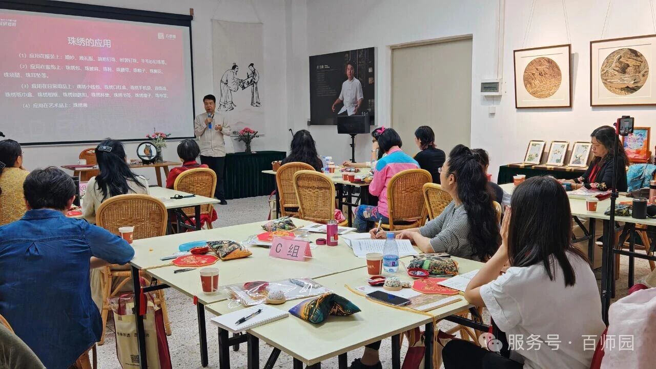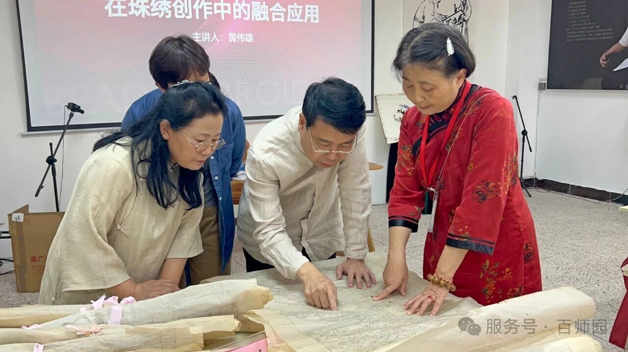 在理论课堂上,黄伟雄大师围绕《珠绣理论课》开篇,加《珠绣十大基本针法》《珠绣历史》《珠绣团扇的绣制方法》《珠绣作品的色彩搭配与创作》《珠绣作品点评与答疑》《现代设计思维在珠绣创作中的融合应用》《珠绣画构图法则与视觉美感解读》等课程,从基础技法到创作思维层层递进,既拆解了珠绣针法的操作要点,又结合自身30余项国家级金奖作品的创作经验,分享色彩搭配的美学逻辑与作品背后的文化表达。