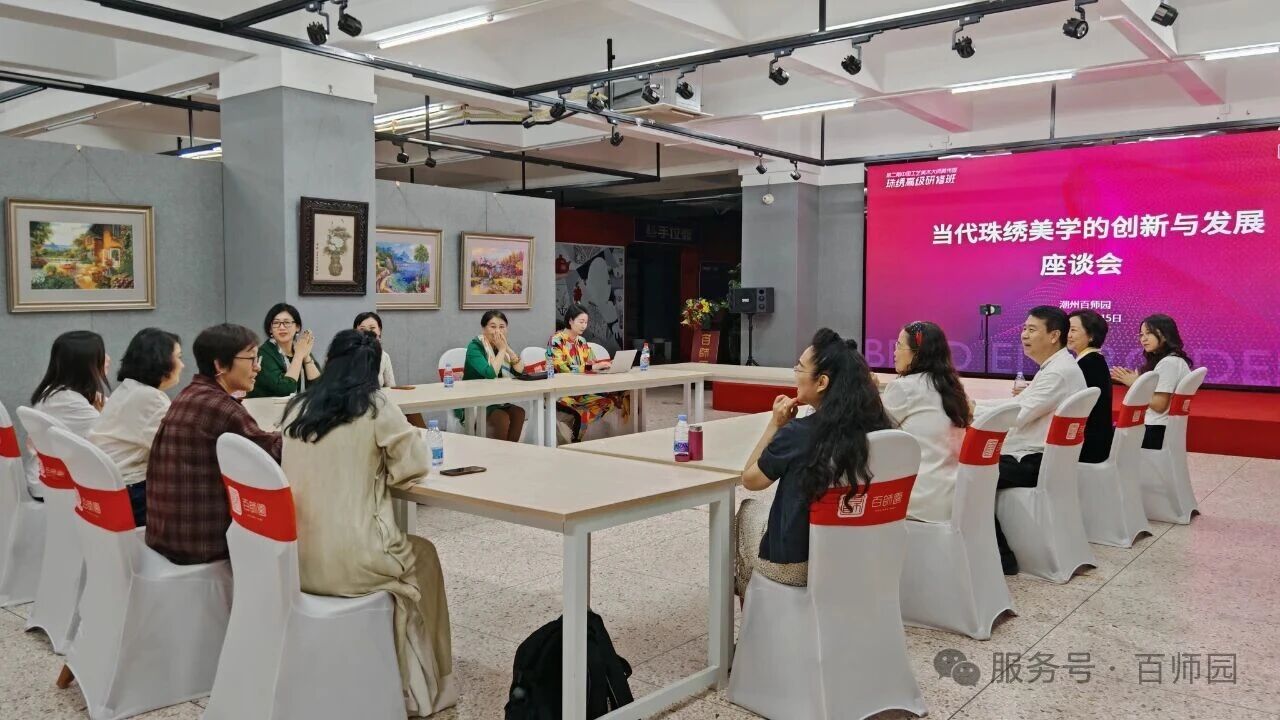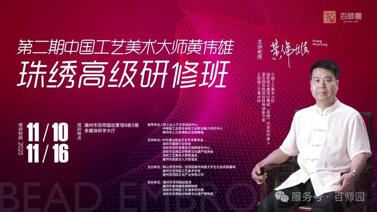 11月11日,研修班在潮州百师园正式开班。作为本次研修班的核心亮点,中国工艺美术大师、国家级非遗项目粤绣(珠绣)代表性传承人黄伟雄全程亲授教学,将“理论+实操+调研”深度融合,构建起系统化的珠绣课程体系。