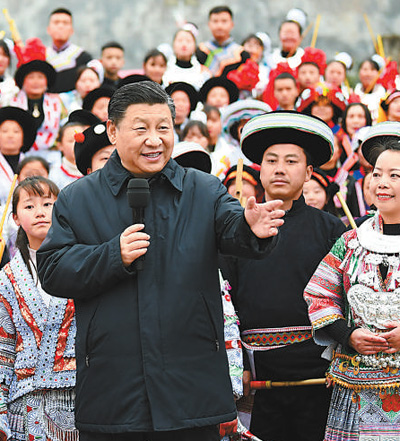 2月3日至5日,中共中央总书记、国家主席、中央军委主席习近平来到贵州考察调研,看望慰问各族干部群众,向全国各族人民致以美好的新春祝福。这是3日下午,习近平在毕节市黔西县新仁苗族乡化屋村考察结束时,乡亲们依依不舍簇拥着总书记,齐唱苗家留客歌。 新华社记者 谢环驰摄 |