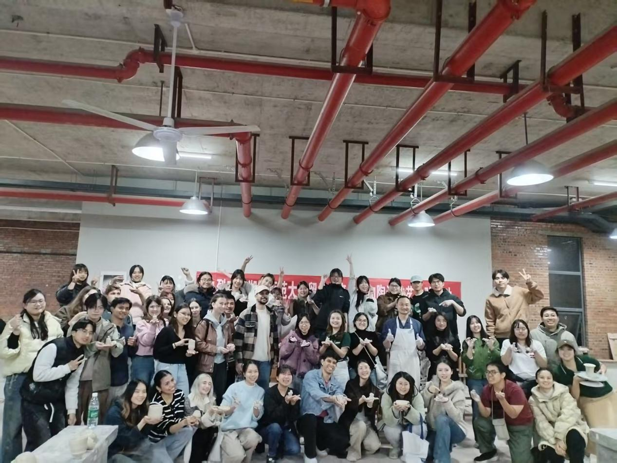 随后,留学生前往陶艺体验工坊实操。全国技术能手谭子林老师及陶瓷专业学生手把手指导,从揉泥、定中心到拉坯塑形,细致讲解技法。留学生们热情尝试,虽初次操作略显生疏,却在指导下逐步掌握技巧,亲手将泥料塑造成型。看着初具形态的作品,大家成就感满满,现场欢声笑语不断。