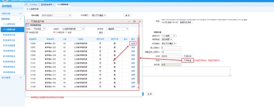 点击【可用教室】,系统弹出可用的教室,点击教室右侧的选择即可。教室可以自行按条件搜索。