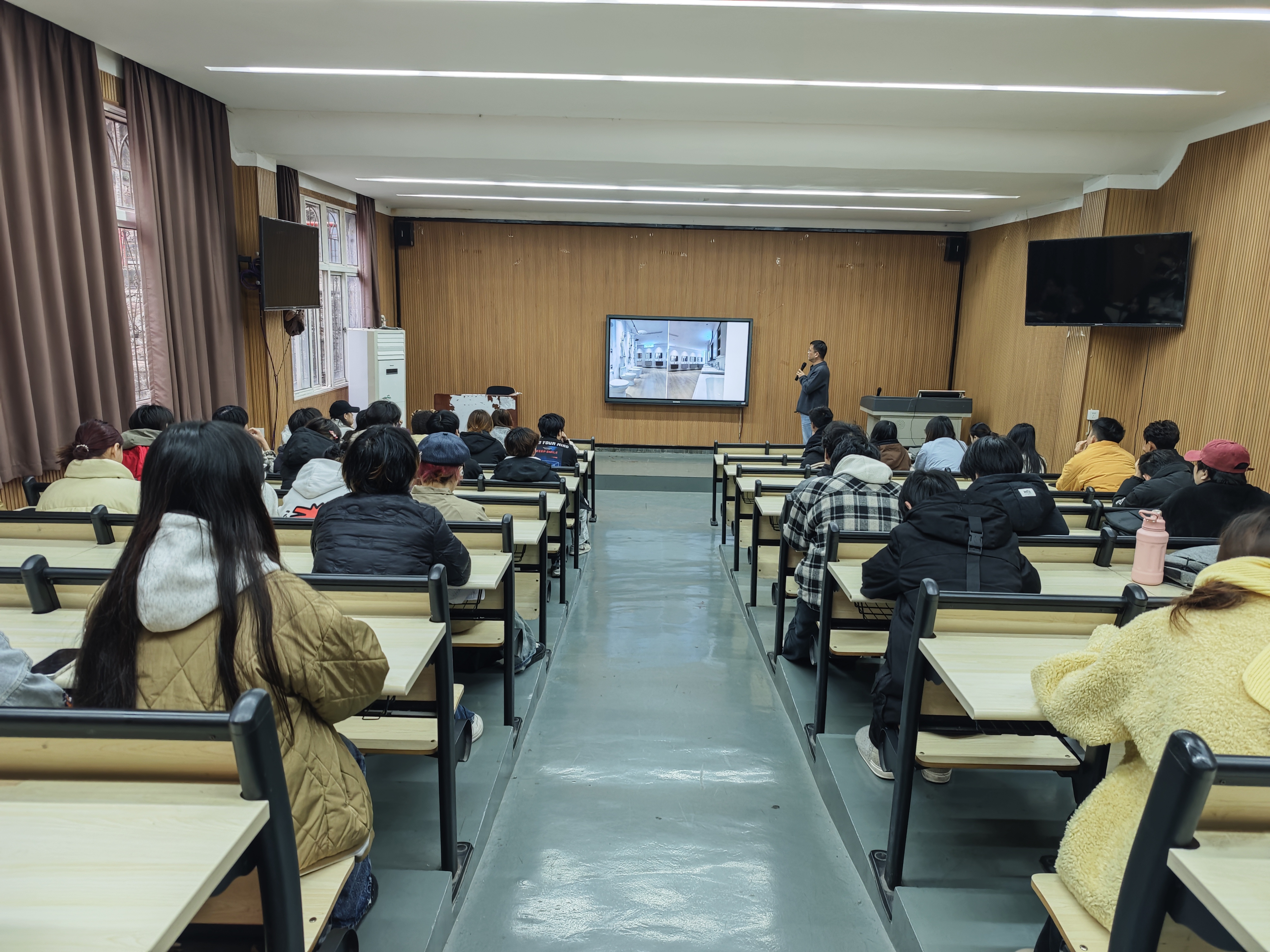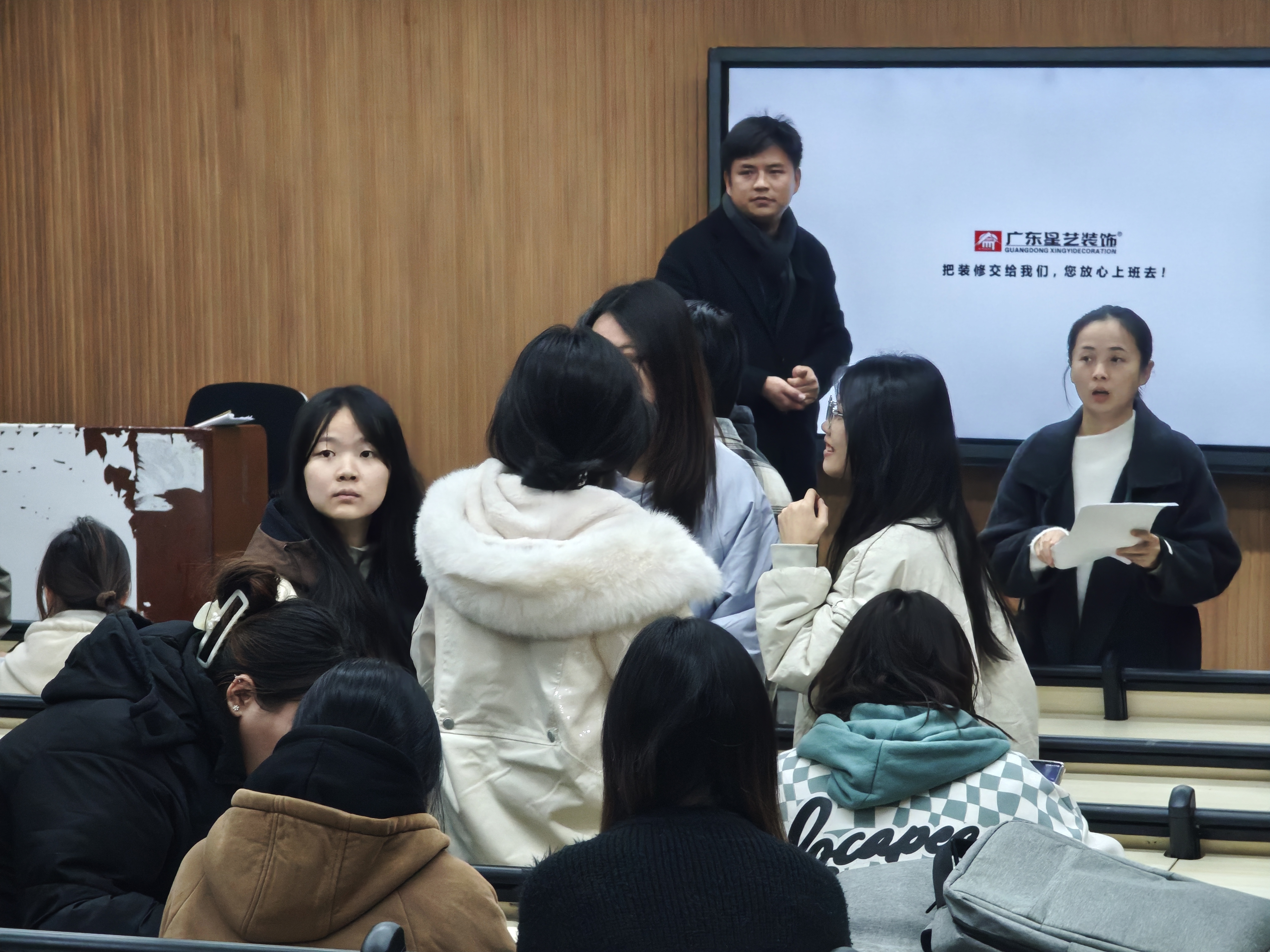招聘会上,公司负责人饶总通过企业宣传片、PPT展示等形式,系统介绍了星艺装饰的发展历程、企业文化、业务布局以及人才需求,并着重表达了公司对设计类专业人才的重视与期待。其真诚的讲述和清晰的职业发展通道介绍,极大调动了在场学生的求职积极性。
