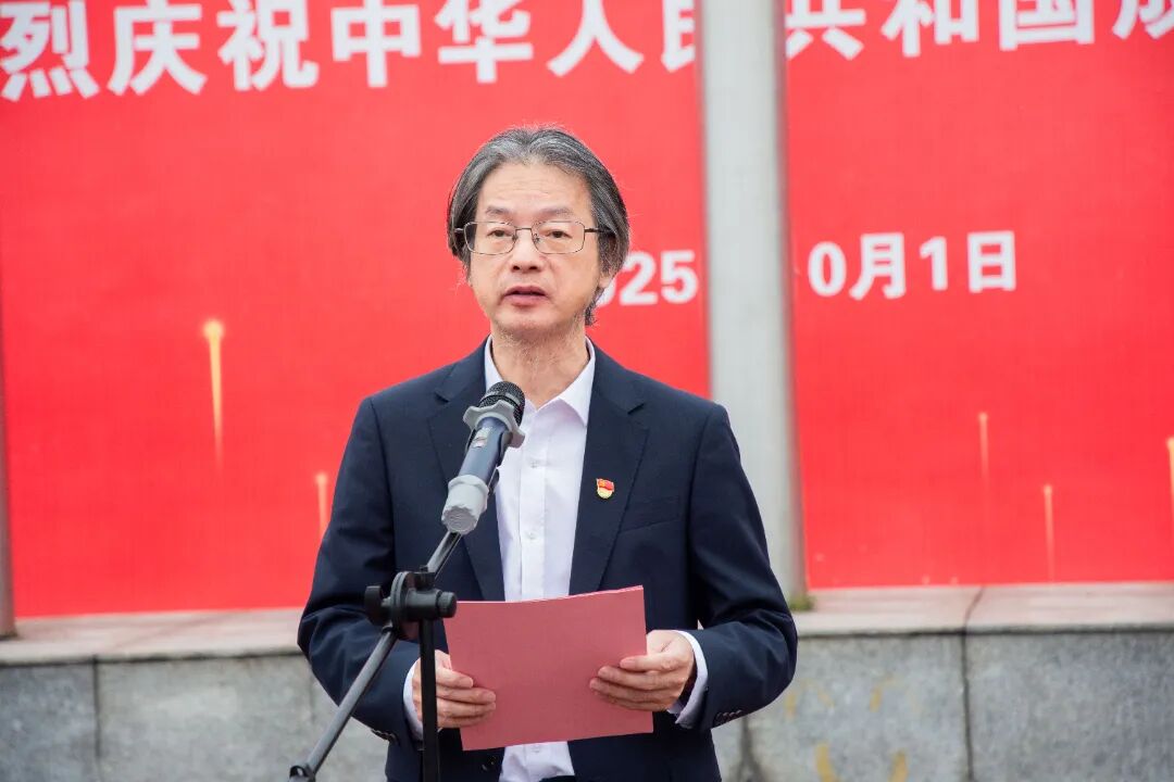 升旗仪式后,陈鸿俊发表了国旗下的讲话。他回顾了新中国成立76年以来,在中国共产党的领导下取得的举世瞩目的伟大成就,讲述了从站起来、富起来到强起来的历史性跨越。他强调,在纪念中国人民抗日战争暨世界反法西斯战争胜利80周年之际,全体师生要深切缅怀革命先烈,大力弘扬伟大抗战精神,从中汲取砥砺前行的强大力量。站在建校50周年的历史节点上,陈鸿俊对全体师生提出三点希望:一是要以信仰为舵,在传承红色基因中锚定航向,深入学习贯彻习近平新时代中国特色社会主义思想,将爱国主义精神内化于心、外化于行;二是要以创新为帆,在推动高质量发展中破浪前行,立足办学特色,深耕湖湘文化沃土,主动对接国家和区域发展战略需求;三是要以实干为桨,在技能报国征程中奋楫争先,弘扬工匠精神,锤炼专业技能,努力培养德智体美劳全面发展的社会主义建设者和接班人。