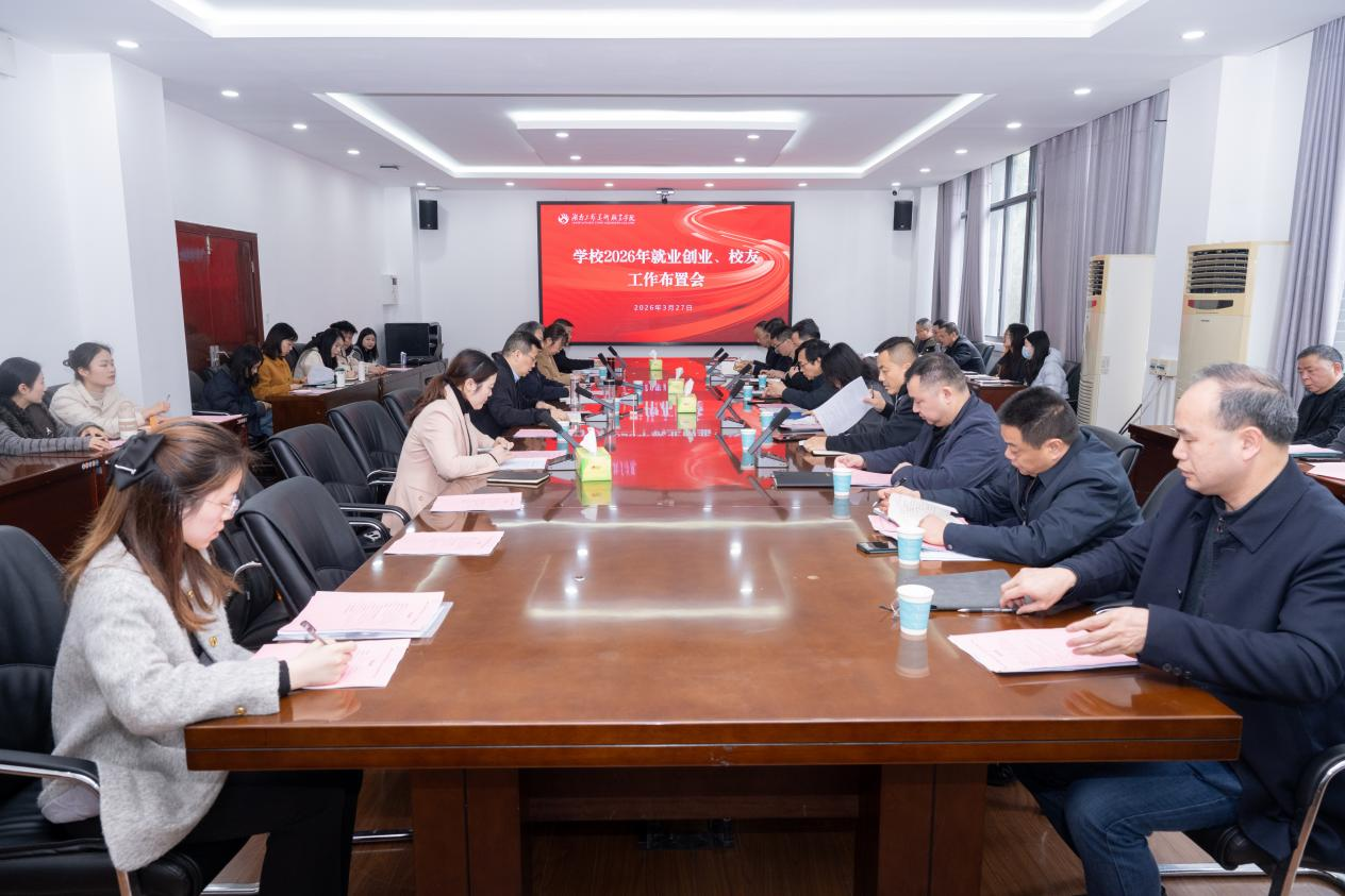 3月27日上午,学校在致美楼201召开2026年就业创业、校友工作部署会,全面推进2026届毕业生就业创业及校友工作。学校党委书记陈鸿俊、校长夏能权出席会议并讲话,副校长张华主持会议。各二级学院党政领导班子、招生就业专干、2026届毕业班辅导员及招生就业与创新创业指导处全体成员参会。