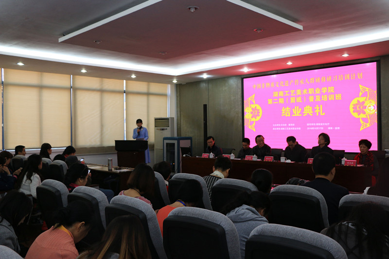 11月10日上午,由文化部、教育部主办的中国非物质文化遗产传承人群研修研习培训计划湖南工艺美院第二期(剪纸)普及培训班结业典礼在学校致美楼206会议室举行。湖南省文化厅非遗处处长陈友材,湖南工艺美术职业学院校长余克泉、副校长陈鸿俊、刘英武,培训中心主任高建民,湖南省工艺美术大师、梅山剪纸省级非遗传承人向亮晶以及培训班全体学员参加结业典礼,学校非遗管理中心、培训中心等部门相关老师到场参加。结业典礼由副校长陈鸿俊主持。