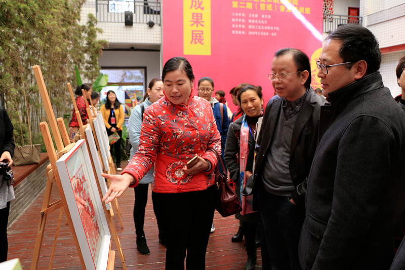 学校培训中心主任高建民做培训班工作总结,从组织管理、课程教学、生活服务、宣传报道等方面回顾了一个月培训所做的工作。向亮晶大师点评学员剪纸作品,她谈到通过一个月的培训学员剪纸技艺提升显著,并赞扬学员的勤奋好学、认真刻苦。副校长刘英武宣读培训班优秀学员表彰决定,为获奖学员颁发荣誉证书。来至怀化的优秀学员代表蒲爱发言,她说在这次培训中结识了良师益友,收获了友情,提升了技艺,拓展了眼界,体会到了太多的感动。来至四川的优秀学员代表兰小奇用幸运、欢笑、感恩等词总结了此次培训的感受,她表示将学以致用,带动更多的人传承剪纸非遗文化。结业典礼上全体学员赠送一幅班集体创作的剪纸作品《生生不息》给学校,表达他们对老师、学校和非遗传承事业的美好祝愿。