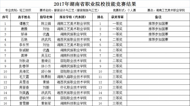 附:2017湖南省职业院校技能竞赛高职服装制版与工艺赛项结果、高职服装设计赛项结果