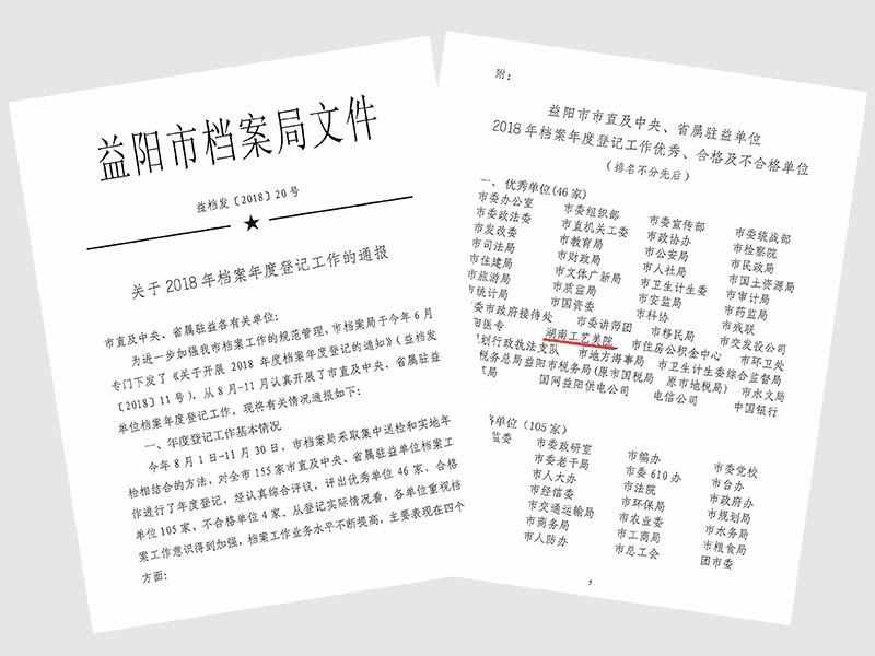 12月13日,益阳市档案局通报了2018年档案年度登记工作的情况,我校获评益阳市2018年档案年度登记工作优秀单位,这是益阳市档案局对我校档案工作的充分肯定。