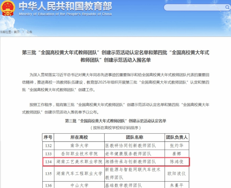 湖南教育新闻网讯(通讯员 罗雨涵 何帅文)9月5日,教育部公布了第三批“全国高校黄大年式教师团队”创建示范活动认定名单,湖南工艺美术职业学院“湘绣传承与创新教师团队”成功获得认定,这标志着该校在教师队伍建设方面取得了重要突破。