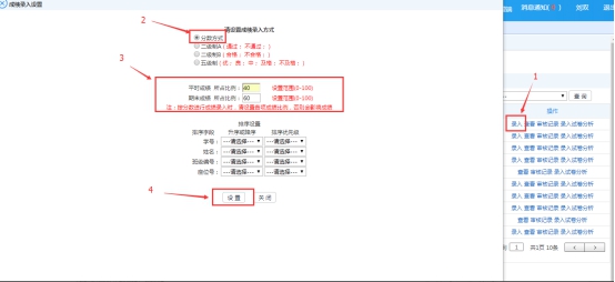 选择分数制录入方式,手动输入各项成绩所占比例,点击【设置】按钮,再点击出现弹窗的【确定】按钮,就可进入成绩录入界面。输入各项成绩即可,系统会自动按照设置好的各项成绩比例计算总成绩。