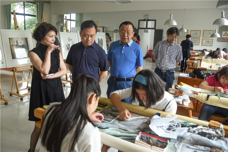 在余克泉校长等人的陪同下,印宇鹰书记一行参观了各系院作品展厅、教学实训场所、大师工作室、教师工作室、创客空间等。结合参观情况,余校长等向来宾介绍了我校专业建设、人才培养模式、创新创业教育、非遗传承创新等方面的情况与做法。印书记一行高度评价了我校人才培养模式、专业特色以及非遗传承保护所做工作等,并对湘绣艺术学院展厅中陈列的湘绣制品赞叹不已。
