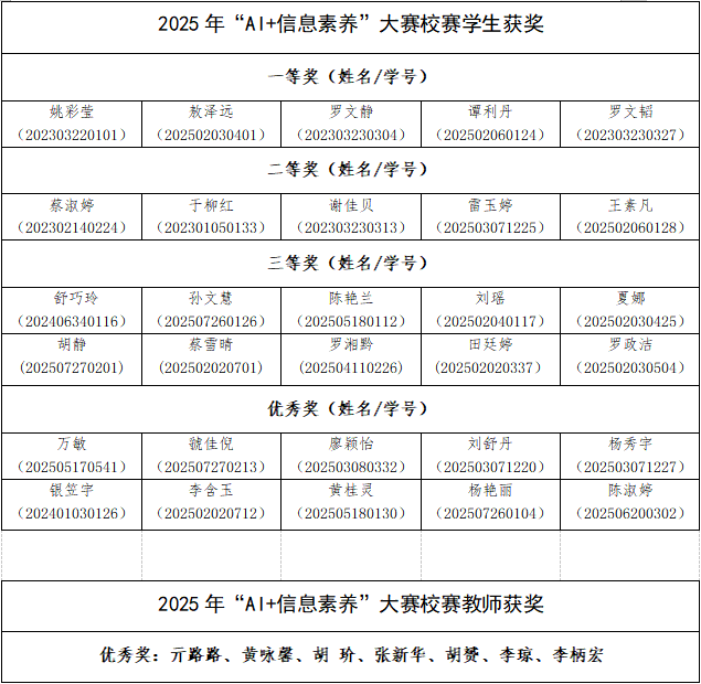 根据《关于开展2025年湖南省高职高专院校“AI+信息素养”大赛的通知》要求,我校已顺利完成校赛工作。此次校赛学生赛共有354名同学参赛,产生一二三等奖以及优秀奖共30名。获奖名单如下: