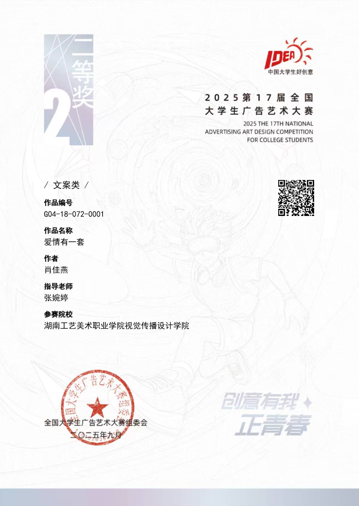 G04-18-072-0001 | G 文案类 | 肖佳燕 | 爱情有一套 | 张婉婷 | 湖南工艺美术职业学院 | 二等奖 |