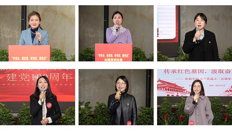 来自环境艺术设计学院党总支的选手欧阳慧以《向前辈报告!》为题,向李大钊、向警予、钱学森等革命前辈报告今日之中国在中国共产党领导下,国家繁荣富强、人民幸福生活的盛世景象,表达了新时代青年在前进道路上必将不负前辈嘱托、接续奋斗的豪情壮志。组织人事处党支部的杨梦云从中国共产党成立的故事娓娓道来,讲述了王淦昌、李大钊等人隐形埋名、以身许国的感人事迹,流露出我们这代青年人对伟大的党、伟大的祖国由衷的赞美和自豪之情。马克思主义学院的李蔓莉带领大家重温了中国共产党成立以来,不同历史时期中国共产党人坚定信仰、知难勇进、无私奉献的奋斗与担当,展现了一名党员教师牢记为党育人、为国育才的初心和使命,敬业乐业、甘于奉献的责任与担当。服装艺术设计学院党总支的姚璎璐以《选择》为题,讲述了100年来一批又一批勇敢的共产党人选择用生命追求信仰的故事,表达了自己在众多职业中选择做一名人民教师的决心和信仰。学生工作部、团委联合党支部的夏子涵带领大家从革命先驱的精神感召中汲取前行的动力,号召大家坚定理想信念,以一往无前的姿态为祖国培养一代又一代堪当民族复兴大任的时代新人不懈奋斗。