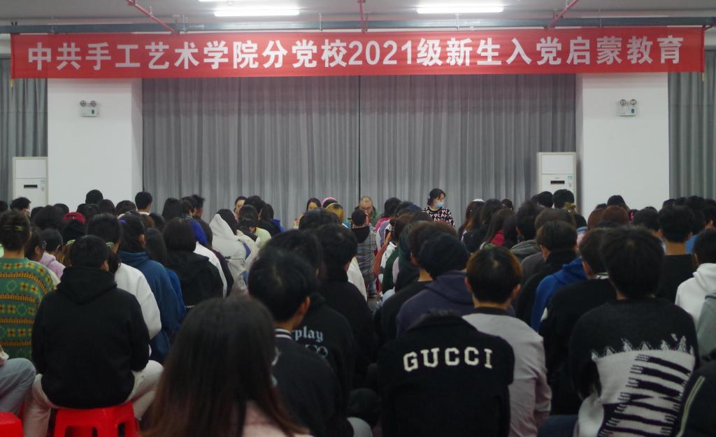 为了深入学习贯彻习近平总书记“七一”重要讲话精神,切实做好高校基层党建工作,进一步完善和发展党员教育培养体系,手工艺术学院牢牢抓住新生入学教育的重要环节,坚持早发现、早选苗、早培养,10月20日晚上,在长沙基地食堂5楼举行了2021级新生入党启蒙教育。学院党总支书记刘亮、学生党支部书记周如一、学生党支部宣传青年委员彭冰如、辅导员老师李璐及2021级全体新生参加本次活动。