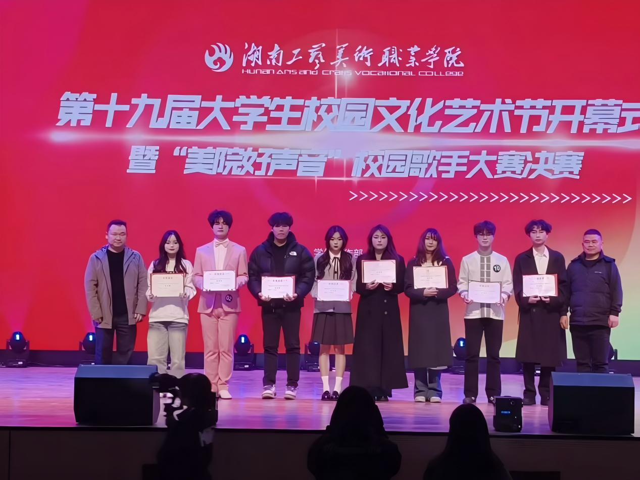 经专业评委现场评审,最终奖项逐一揭晓。服装艺术设计学院张源凭借一首真挚动人的《不要怕》夺得冠军;数字艺术设计学院张麒霈荣获亚军;中职部胡可馨获得季军。湘绣艺术设计学院的肖格、李佳颖组合以其出色的舞台掌控力摘得“最佳台风奖”;中职学部的胡可馨同时荣获由线上投票产生的“最佳人气奖”。其余选手均获优秀奖。颁奖环节结束后,全体选手与嘉宾合影留念,为这个音乐之夜画上圆满句号。