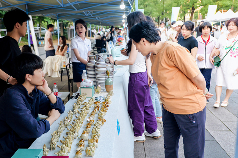 活动现场,各二级学院师生作品的售卖点前人头攒动,吸引了不少市民朋友的围观。湘绣、陶瓷、少数民族首饰、文创产品、木雕等师生创作的作品琳琅满目,受到大家的青睐。