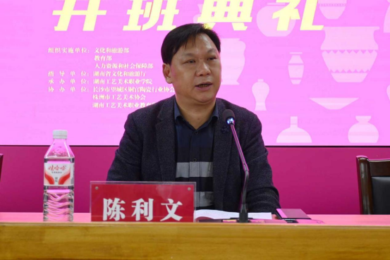 陈利文在讲话中指出,我校是“研培计划”首批参与高校,在非遗传承保护推广方面深耕不辍做出了突出贡献。学校连续承办陶瓷研修班,既是对研培计划的有力践行,更是对湖南陶瓷产业高质量发展的主动担当。同时,他向学员表达了殷切期望:一是恪守本源,做陶瓷传统技艺的“守护者”。希望大家珍惜此次学习机会,深入钻研醴陵窑、铜官窑等湖湘陶瓷的核心技艺与文化内涵,把基础技法练扎实、把文化底蕴悟透彻,让千年陶瓷技艺在我们手中保持本真、代代相传。二是创新表达,做融合发展的“开拓者”。要以研培班为契机,推动数字创意、智能科技与陶瓷非遗的跨界融合,探索“陶瓷+文旅”“陶瓷+国潮”等跨界路径,让传统陶瓷既承载历史记忆,又契合当代审美与市场需求。三是聚力赋能,做“非遗湘军”的“建设者”。希望大家以此次研修为纽带,在学习期间深耕技艺、互学互鉴,在交流中凝聚传承共识、汇聚发展合力,共同为湖湘陶瓷非遗注入团结奋进的力量,让“非遗湘军”的文化底色更鲜明、传承根基更牢固。