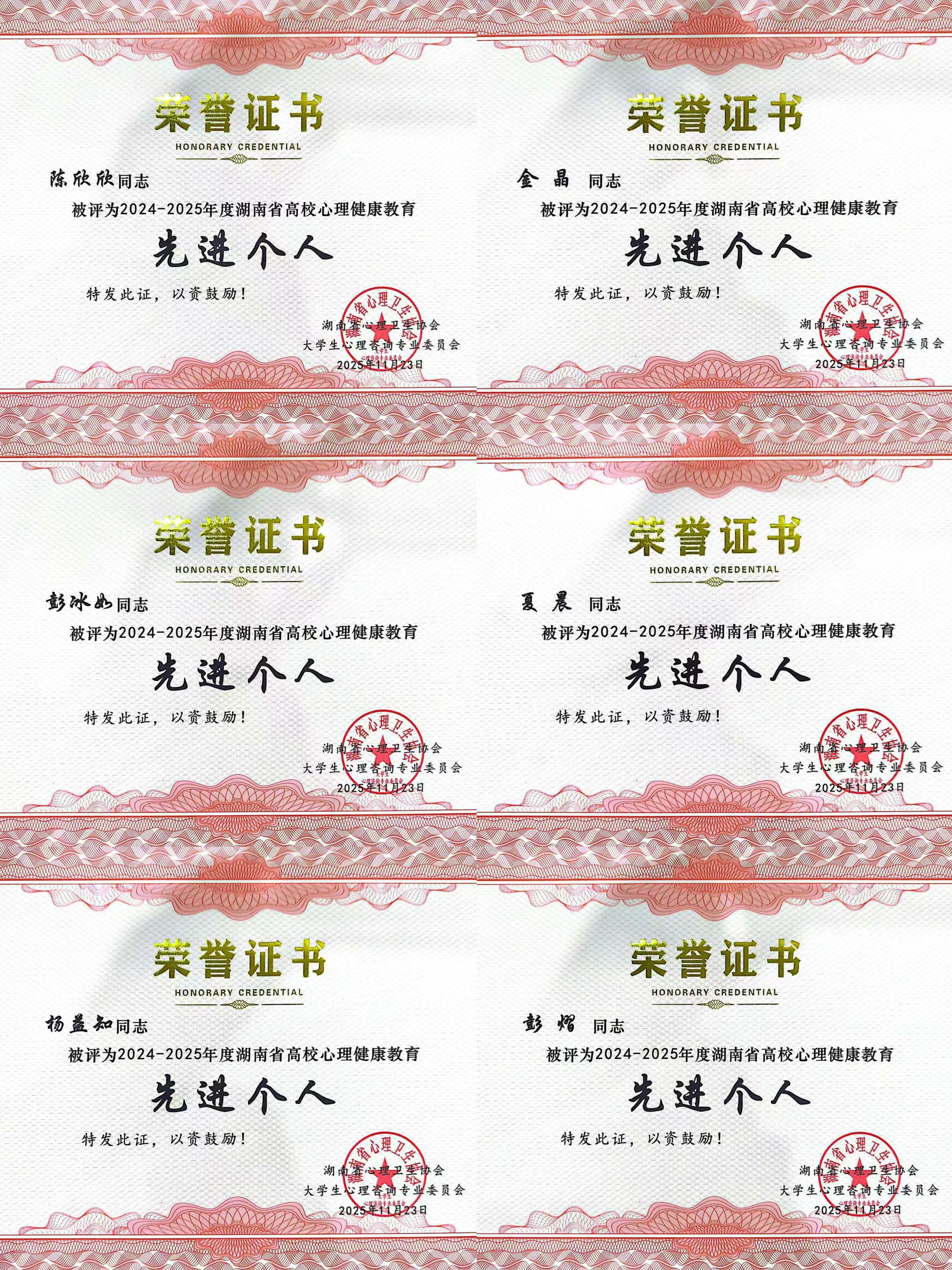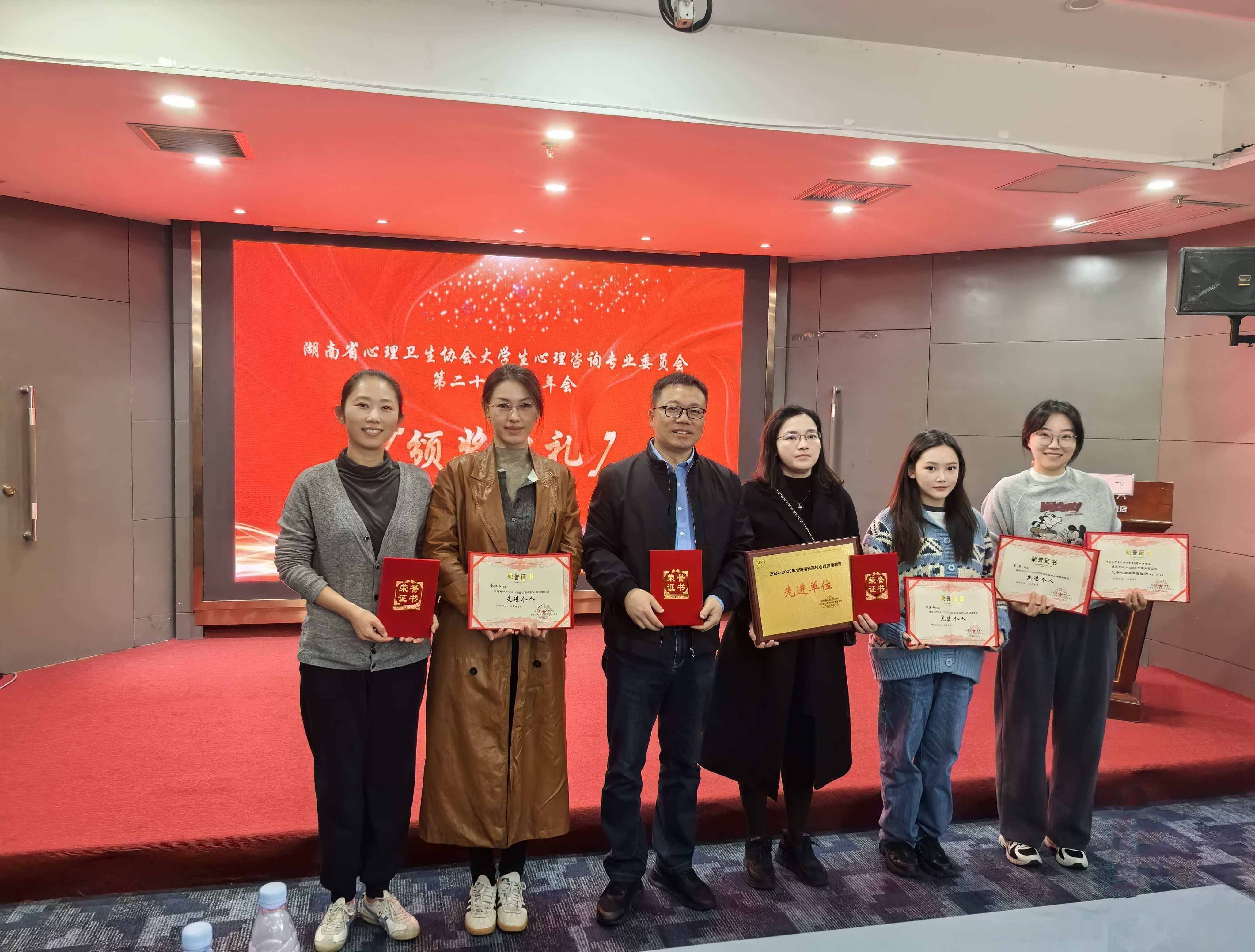 本次年会对2024–2025年度在全省高校心理健康教育工作中表现突出的集体与个人进行了表彰。我校荣获“2024–2025年度湖南省高校心理健康教育先进单位”称号;金晶等六位教师获评“先进个人”;由夏晨老师指导的爱馨心理协会及彭熠老师指导的爱馨心理协会(长沙分会)双双被评为“优秀心理类学生社团”。