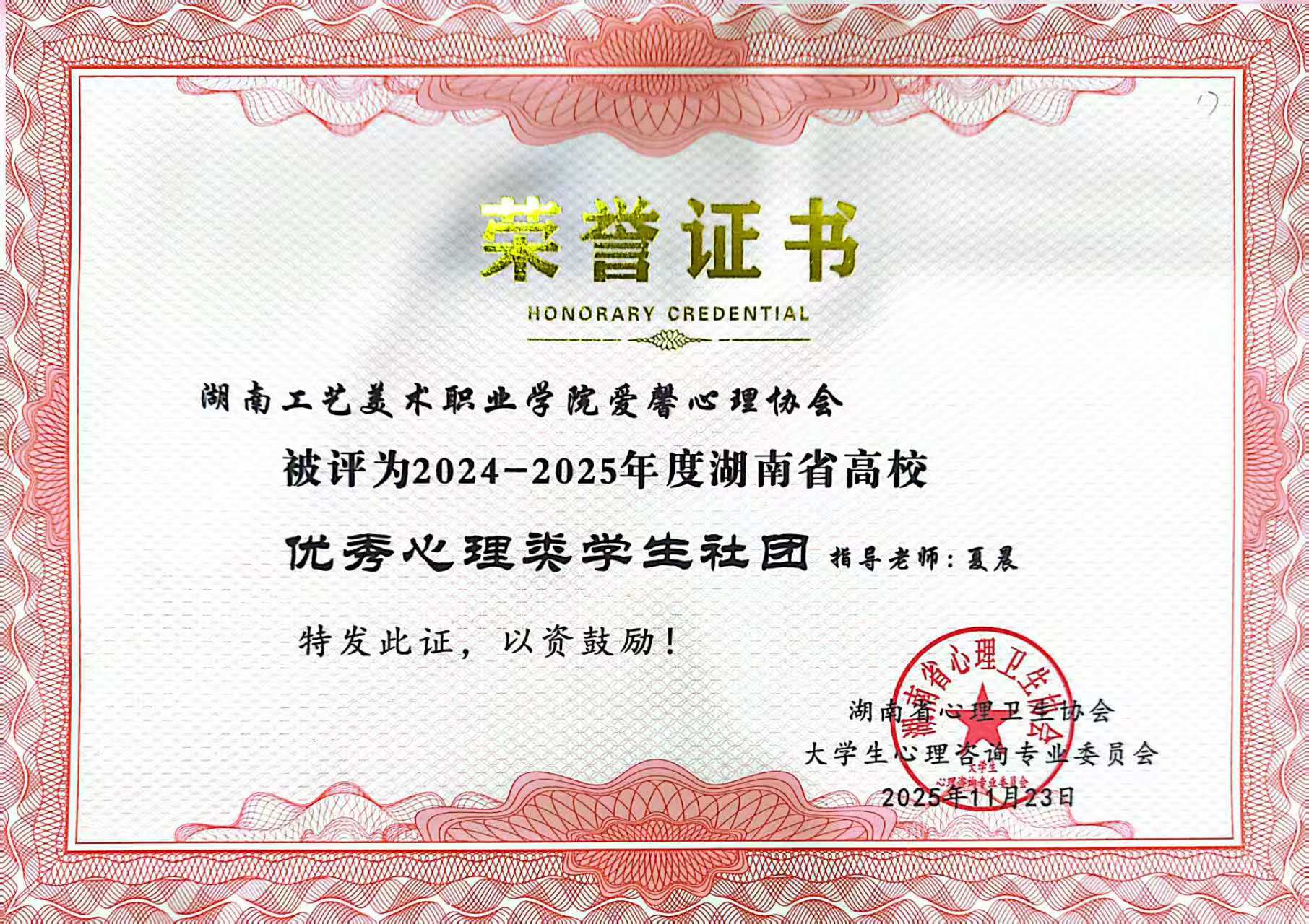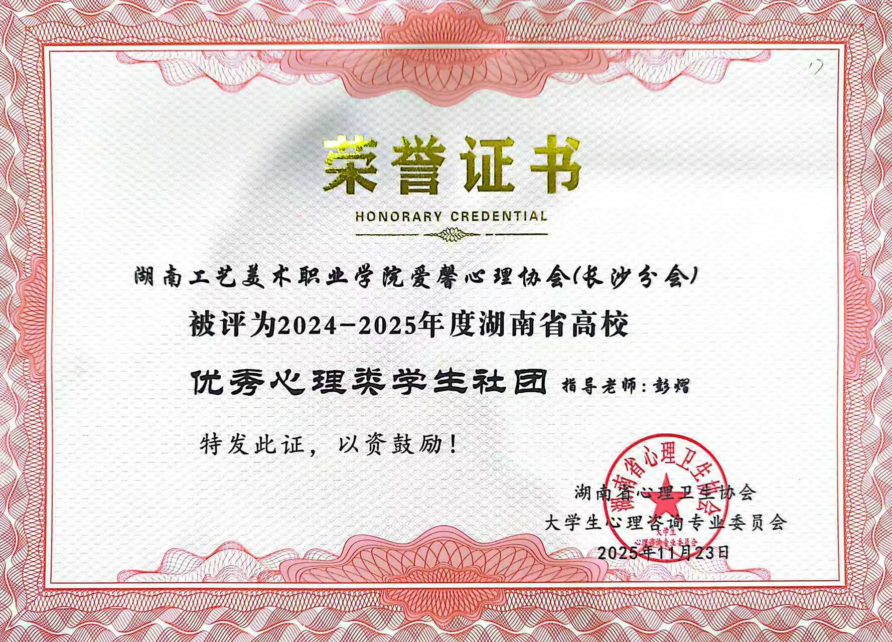 优秀心理类学生社团荣誉证书(长沙分会)