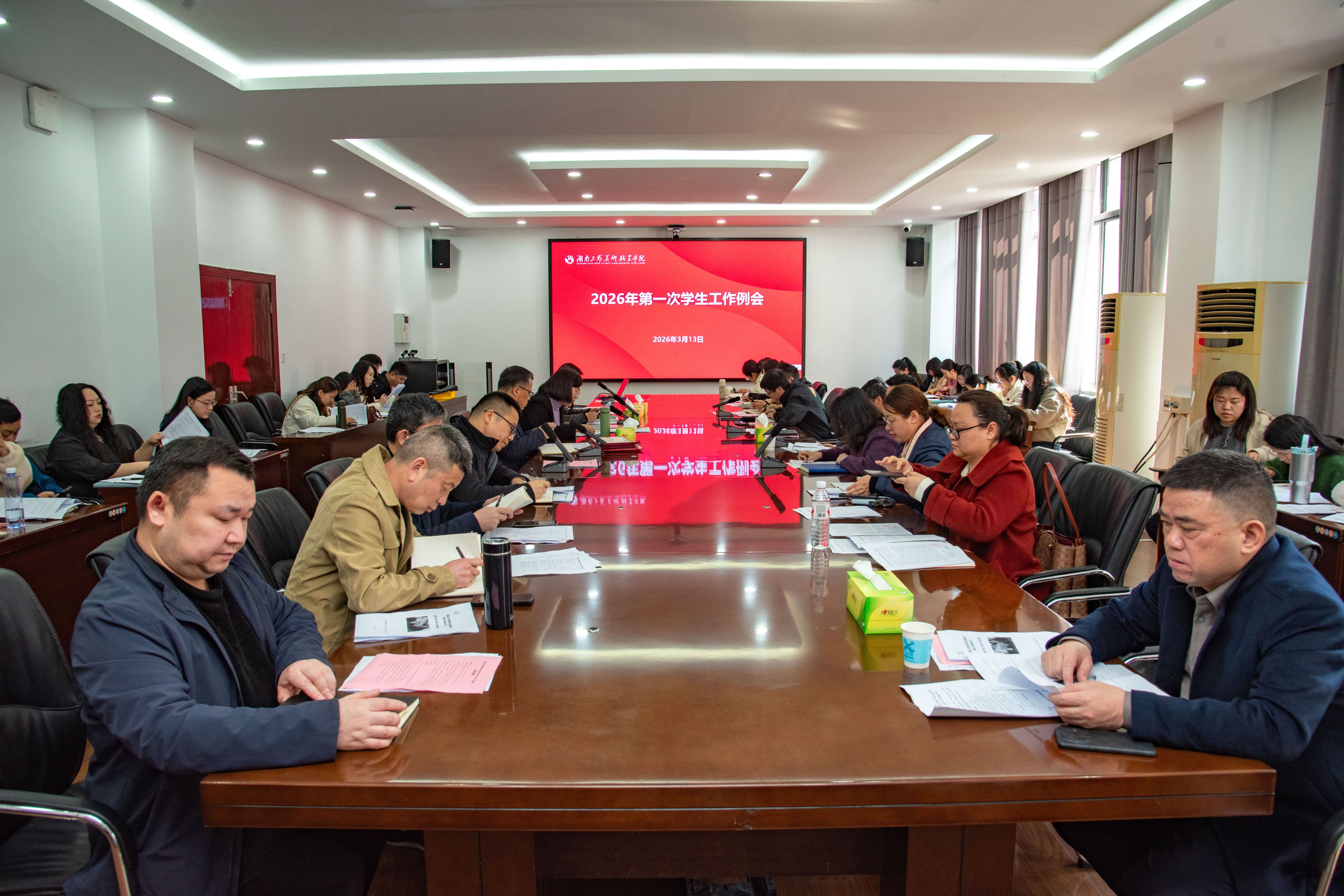 3月13日,学校2026年度第1次学生工作例会在致美楼201会议室召开。 学校党委委员、副校长彭泽立出席会议,学生工作部、校团委、保卫部、科教园服务与实训中心、东校区综合办负责人,各二级学院党总支书记、副书记、全体辅导员及相关教师参加会议。学生工作部部长杨丽敏主持会议。