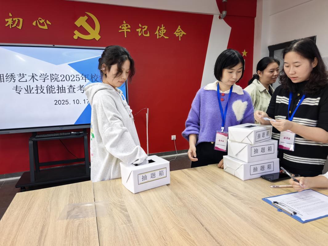 10月17日下午,湘绣艺术学院开展了2025年校级专业技能抽查考试活动。学校教学督导陈政伟主任对本次考试进行了全程监督,湘绣艺术学院党总支副书记蔡胜男、副院长谢文波、教师贺熙华和曹虹进行了考试巡考。