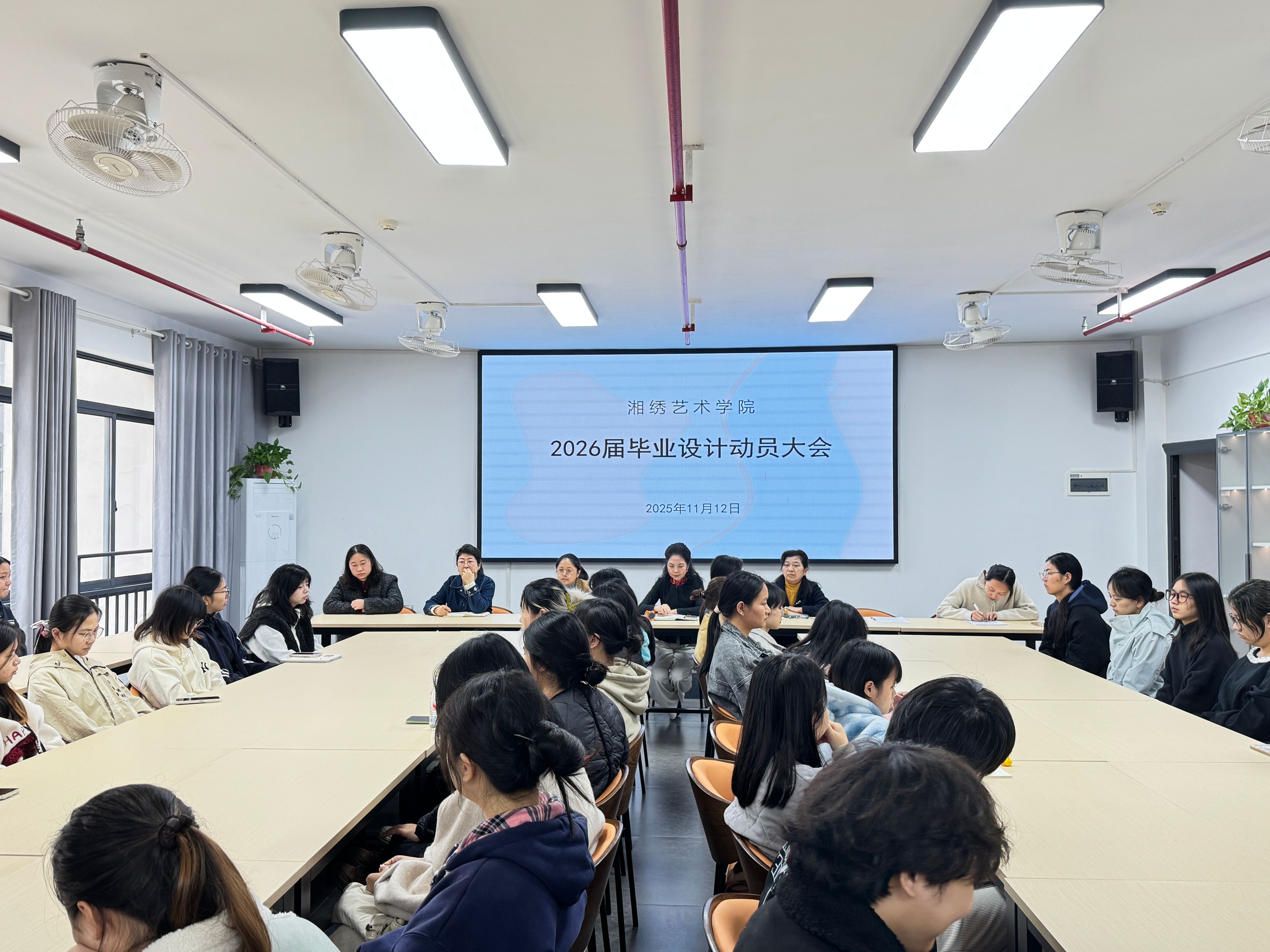 11月12日,湘绣艺术学院在309室召开2023级刺绣设计与工艺专业毕业设计动员大会。学院党总支书记兼院长唐利群、副院长谢文波、学工办主任杨荣及毕业设计相关指导教师、2023级全体毕业生参会,会议由教师曹虹主持。