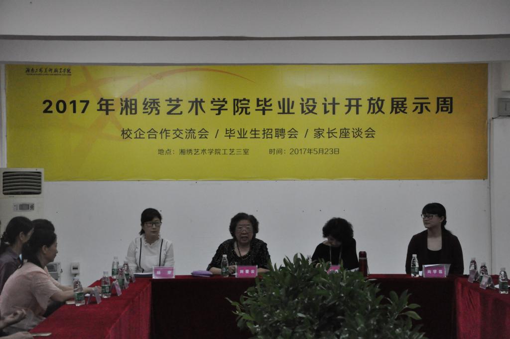 2017年5月23日上午9点半,湘绣艺术学院在湘绣楼二楼刺绣工艺室召开了“梦想绽放——工艺美院开放周”家长座谈会,10多位家长在百忙之中远道而来,莅临湘绣艺术学院参加了这次座谈会,出席本次座谈会的还有亚太手工艺大师、湘绣非物质文化代表性传承人刘爱云、湘绣艺术学院院长唐利群、湘绣专业老师赵蓓瑛、彭慧霞、周慧春、团总支书记、学工办主任杨荣、留校任教的老师们以及全体2017届毕业生,湘绣艺术学院党总支副书记周学莲主持了会议,唐利群为座谈会致欢迎辞。