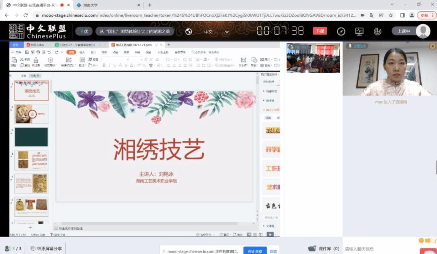 近日,由湖南大学主办、湖南工艺美术职业学院承办的 “汉语桥” 线上湘绣技艺培训项目成功举办。湖南工艺美术职业学院湘绣艺术学院教师刘艳冰通过历史溯源、成品展示、流程拆解与技法演示,带领来自布隆迪的200多名学生沉浸式感受中国非物质文化遗产的独特魅力,领略湖湘刺绣文化的深厚底蕴。