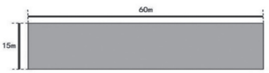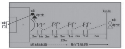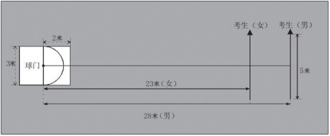 测试方法:如图4所示,在球场适当位置画一条15米线段作为测试区横宽,从横线两端分别向场内垂直画两条60米以上平行直线作为测试区纵长,标出距离数。测试者在起点线后将球用手掷远3次(允许带手套进行),再用脚踢远3次(采用踢凌空球、反弹球、定位球等方法不限),各取其中最好一次成绩相加为最终成绩。每次掷、踢球的落点必须在测试区内,否则不计成绩。评分标准见表8。